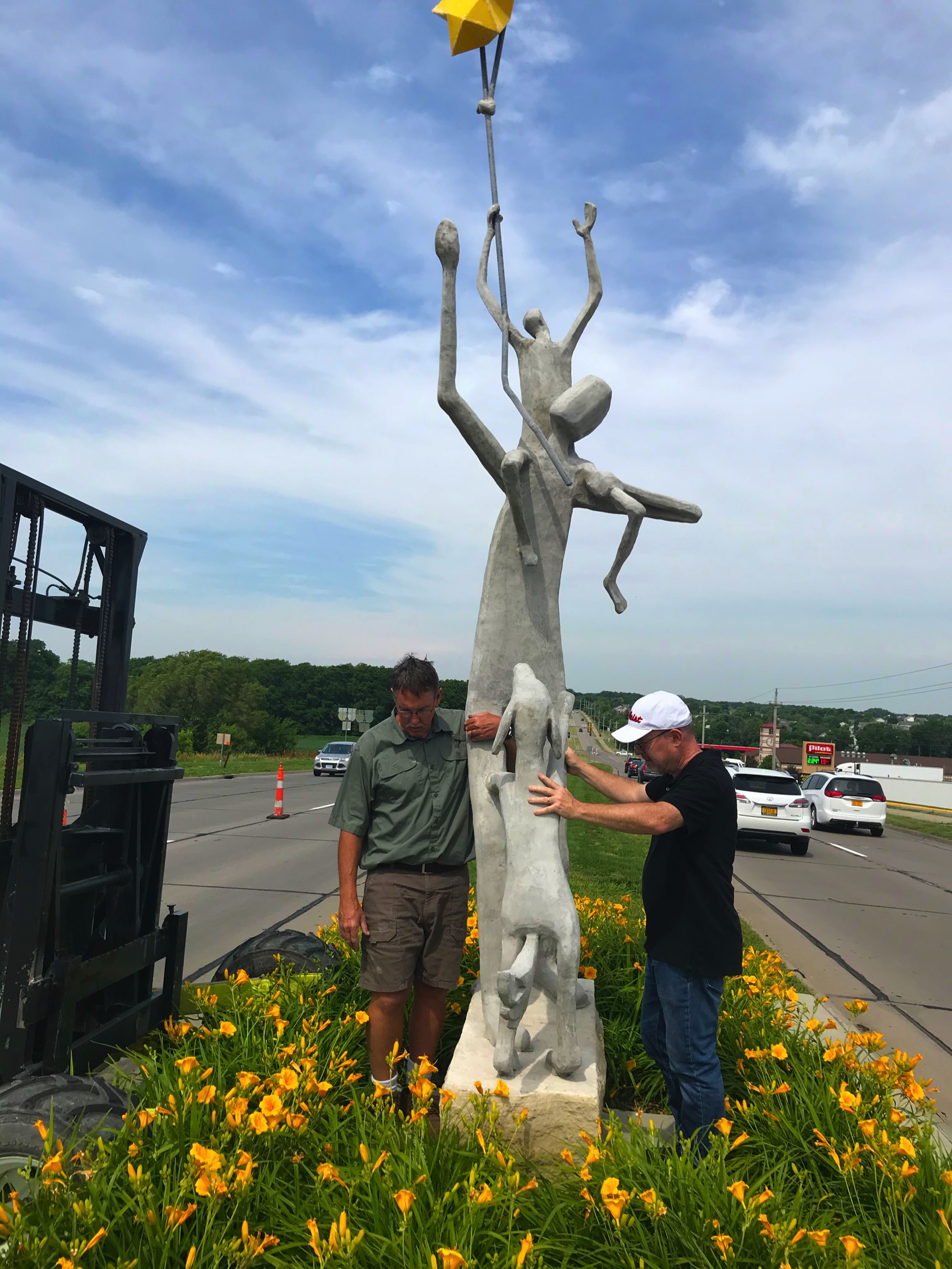 Artist Statement: It's my hope that these 2 sculptures, "Love You to the Moon" and "Raise You to the Stars" might be quiet reminders along a busy interchange of what is truly important: a love for family, a nurturing of children, a strong sense of home and a hope in the future.