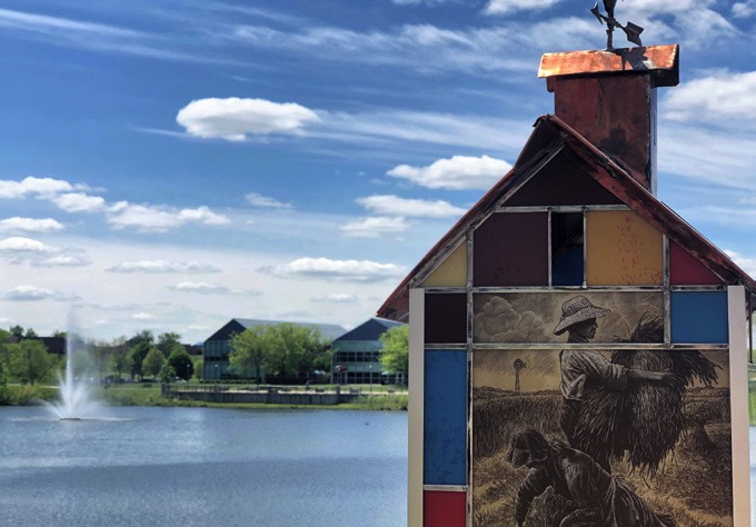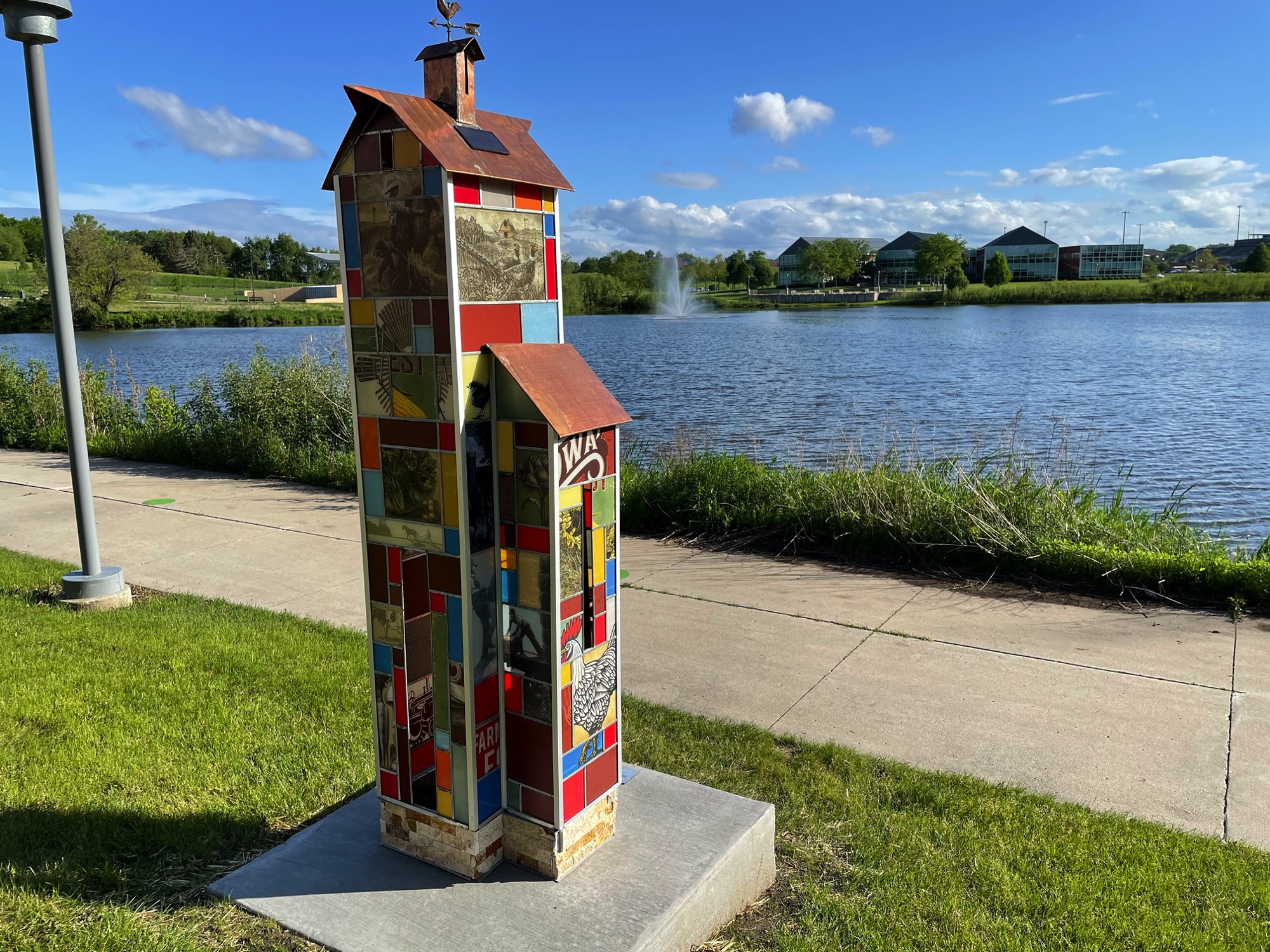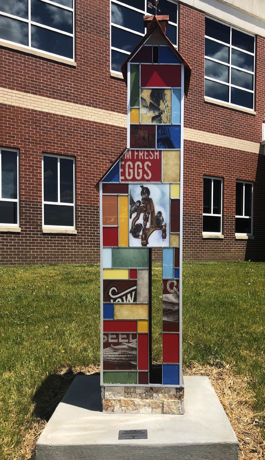 This art celebrates the rapidly disappearing barns the are a part of our Iowa heritage. Created to look like stained glass, some panels using the textures of printed seed corn and agricultural related ads and images. Currently part of the 2021 West Des Moines Art on Campus Exhibit.