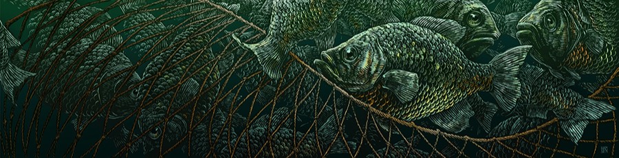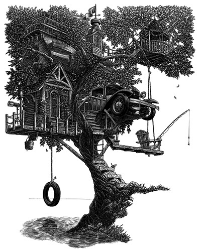 Unlike many drawing techniques, where an artist adds in the mid-tones and shadows, with scratchboard I work backwards, adding highlights to create an image. A sharp edged knife is used scratch away the black ink from the board revealing the white clay underneath. Scratchboard has a smooth, absorbent kaolin clay ground that is evenly coated with India ink. Crisp, clean lines create exquisitely detailed white-on-black art. Color can be added once the line art is complete using watercolor wash, dies, or digitally added.