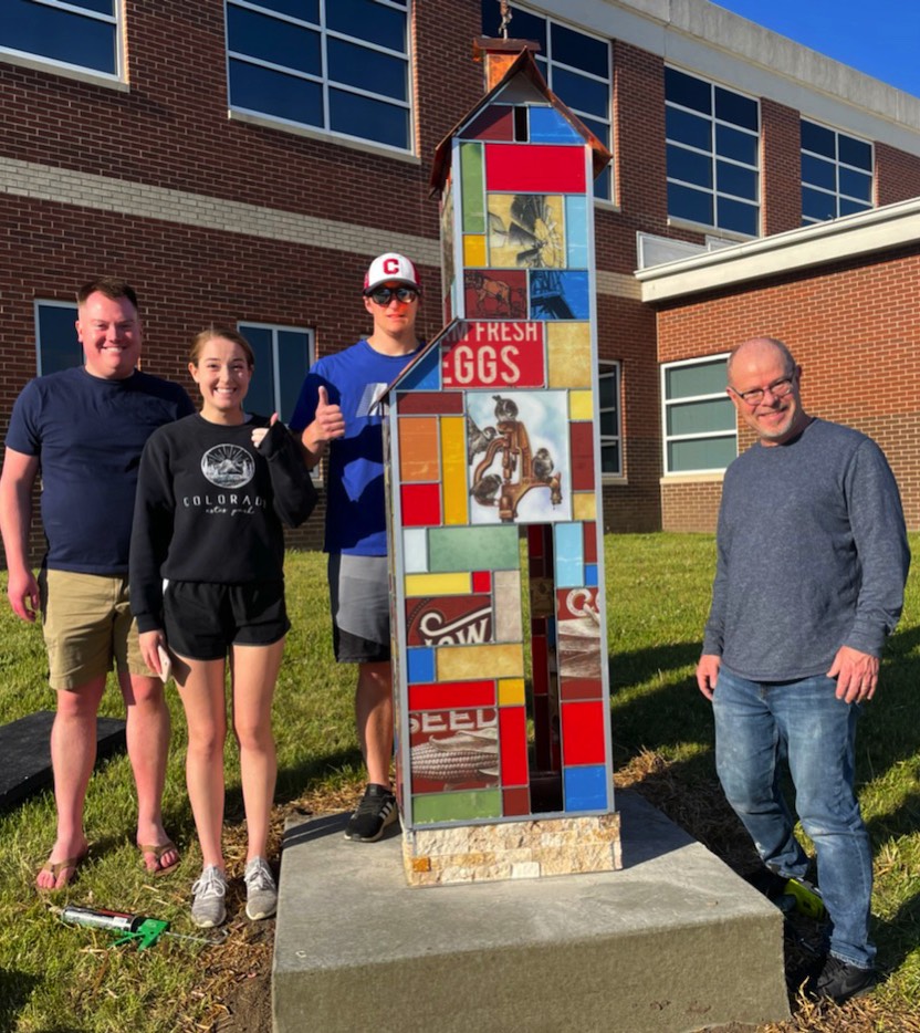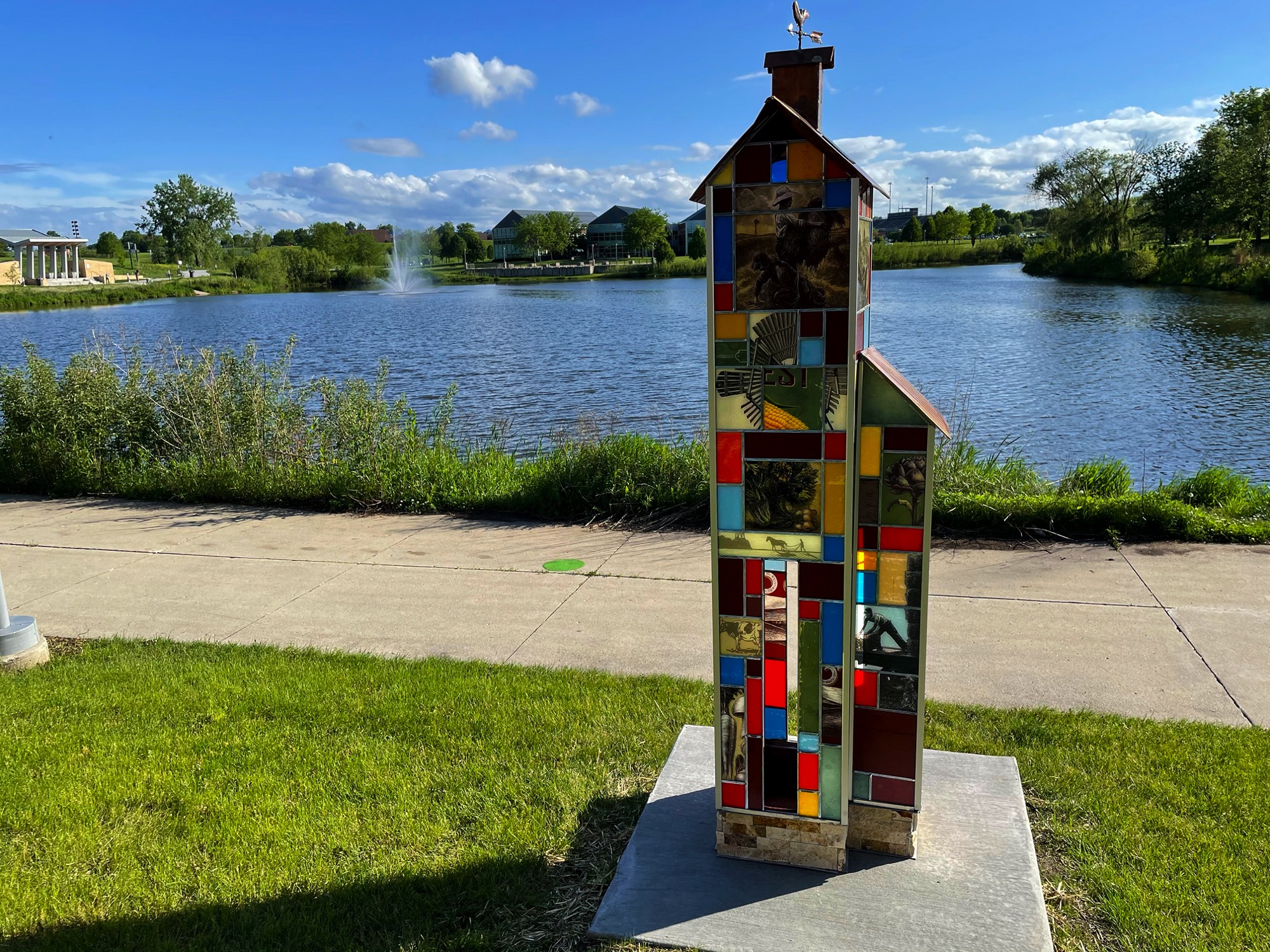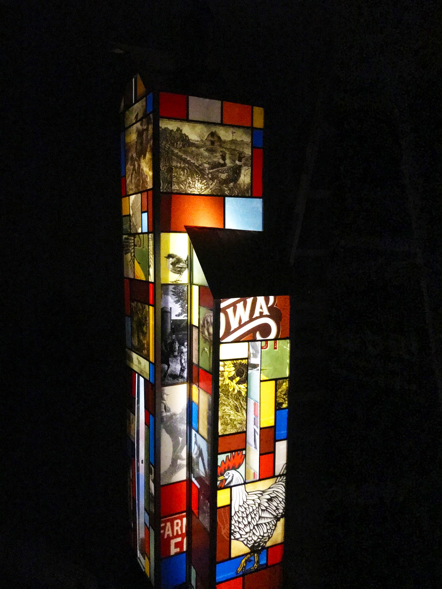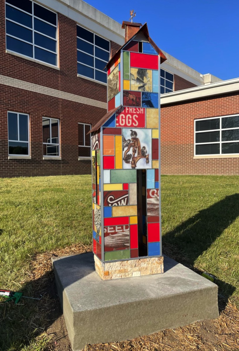 This art celebrates the rapidly disappearing barns the are a part of our Iowa heritage. Created to look like stained glass, some panels using the textures of printed seed corn and agricultural related ads and images. Currently part of the 2021 West Des Moines Art on Campus Exhibit.
