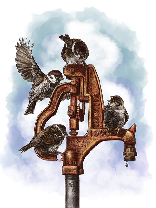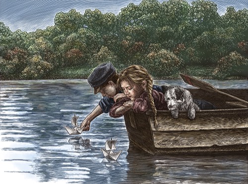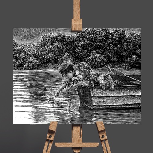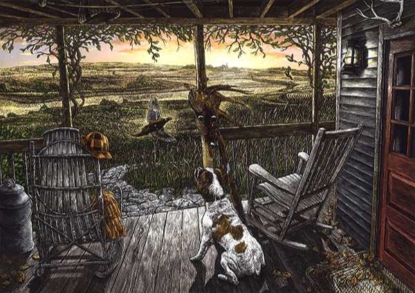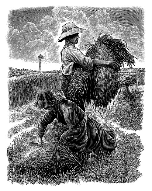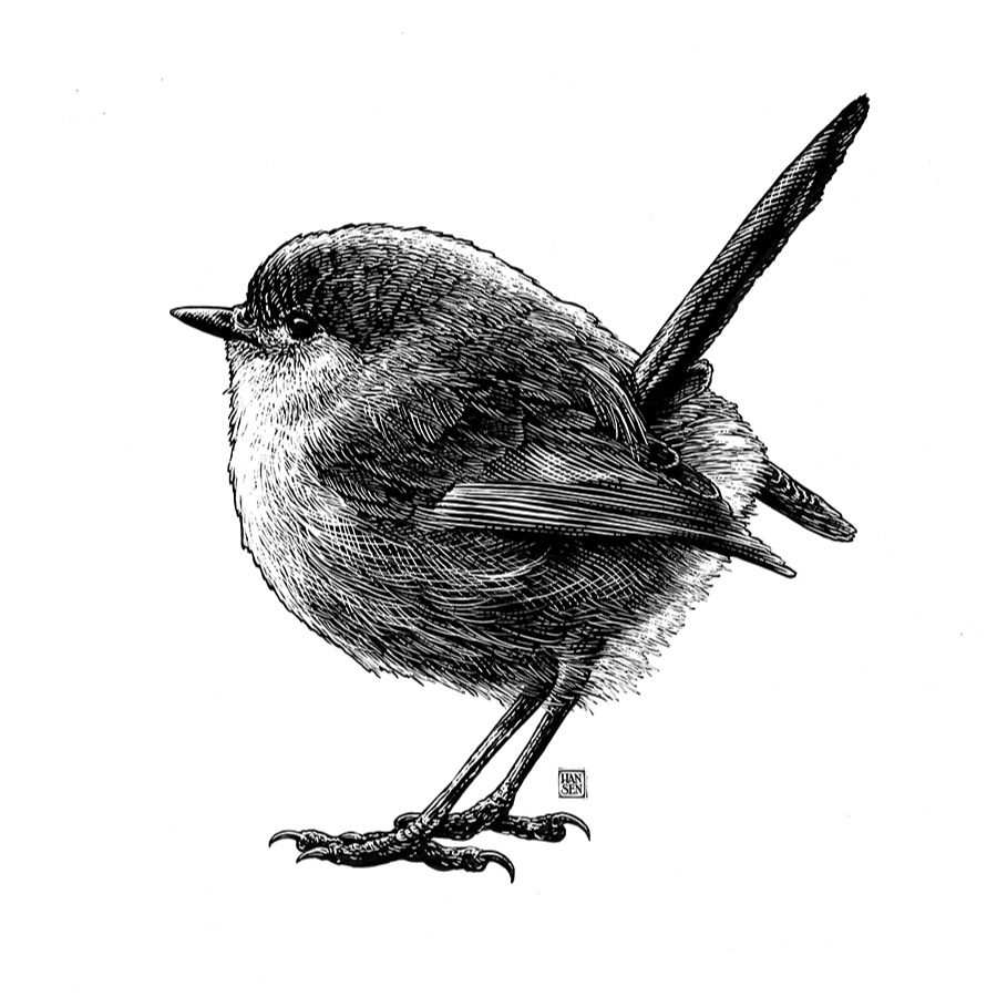 Unlike many drawing techniques, where an artist adds in the mid-tones and shadows, with scratchboard I work backwards, adding highlights to create an image. A sharp edged knife is used scratch away the black ink from the board revealing the white clay underneath. Scratchboard has a smooth, absorbent kaolin clay ground that is evenly coated with India ink. Crisp, clean lines create exquisitely detailed white-on-black art. Color can be added once the line art is complete using watercolor wash, dies, or digitally added.